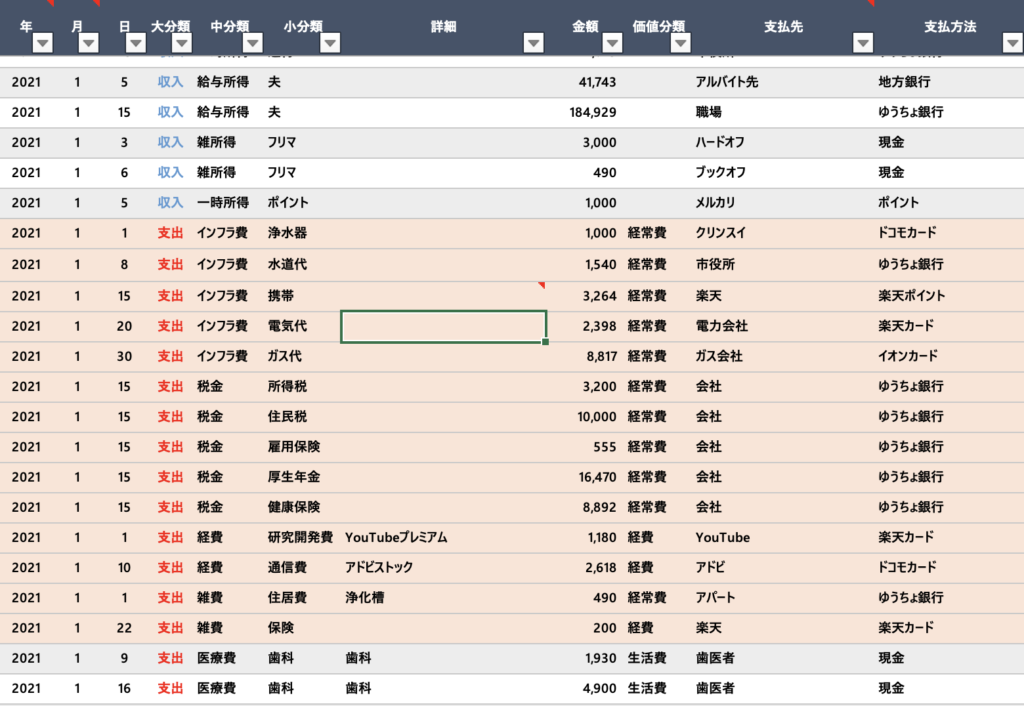↓のように記録表の「価値分類」の列を「特別費」と入力したものが特別費管理表に反映されます