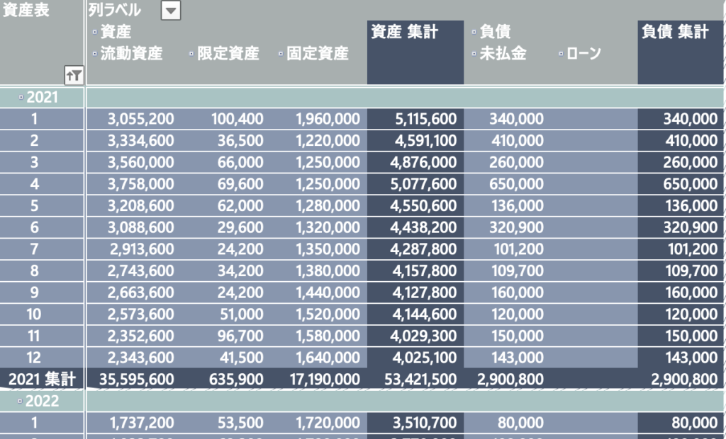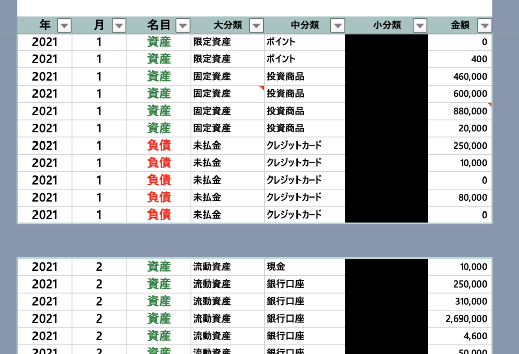 ↓が資産表です(他にも純資産表と純資産推移グラフも同時に作成しています)