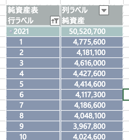 資産記録表からピポットテーブル機能を使って。資産表を作成します。